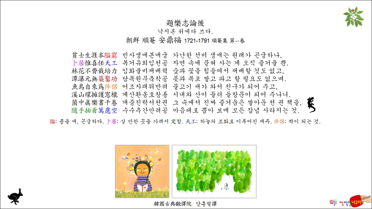 題樂志論後 문어론에 따라 쓰다. // 貧士生涯本隘窮, 卜居惟喜任天工. Linhua不費栽培力, 潭瀑元無築鑿功.~~~//가난한 선비의 삶은 원래 가난했지만, 자연 속에 파묻혀 산다는 것은 재미뿐이다. ..