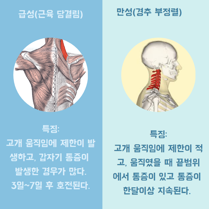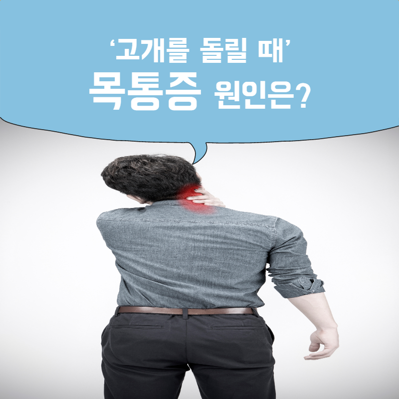 목을 돌릴 때의 통증은 앞으로 구부리거나 왼쪽으로 돌릴 때 경미하고 뒤로 젖히거나 머리를 오른쪽으로 돌릴 때 심하며 노란색 표시가 통증입니다.