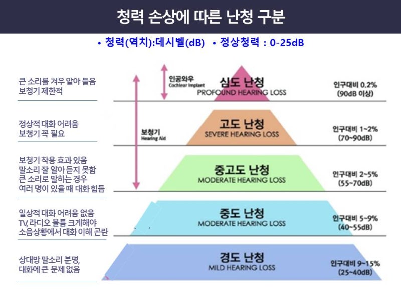 의사소통에 어려움이 생기지만, 특히 번화한 장소에서는 대화가 잘 되지 않습니다. i, j, ㅎ와 같은 고음역대에 해당하는 자음이 잘 안들려서 ㄱ,ㄴ,ㄷ과 같은 자음에 대한 분별력이 점점 감퇴가 됩니다 또한 내 말을 자각하지 못하고 크게 말하게 되고 상대방의 말소리가 중얼거리는 것처럼 똑똑히 들리지 않는다고 합니다. 뿐만 아니라 귓속이 꽉 차서 막힌 느낌이 들고 이명도 있을 수 있습니다. 사실 처음에는 자각하기 어렵고 문제가 있어도 내버려 두는 경우가 많습니다. 대처가 늦어지고 상황이 악화되면 어지럼증이나 심한 피로, 두통, 스트레스 등이 더 심해질 수 있기 때문에 위 증상이 있는 경우 조기 진단을 받아 적절한 치료를 받아야 합니다. 한번 나빠지면 회복되지 않는다고 하니 저하시키는 요인이 되는 습관을 고쳐 평소 예방하는 노력을 가져갑시다.
