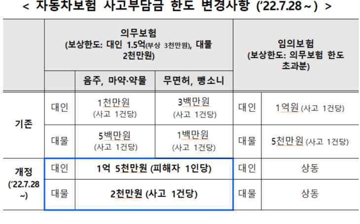 개정 후 사고부담금은 대인배상Ⅰ:1억5천만원(피해자 1인당) 대인배상Ⅱ:1억원(사고 1건당) 대물(의무):2,000만원(사고 1건당) 대물(임의):5,000만원(사고 1건당)으로 변경되었습니다.예를 들어 음주운전 사고로 사망자 2명이 발생하여 대인보험금 1억원(인당 3억원), 대물피해 1억1,000만원이 발생한 경우 개정 전 사고부담금은 대인 5500만원(의무보험 1,000만원, 임의보험 1억원) 대물 5,000만원(의무보험 6억원)=> 총 1억6,500만원 개정 후 사고부담금은 대인 4억원(대인배상 I 3억원, 대인배상 II 1억원) 대물 7,000만원(의무보험 5,000만엔, 합계 1억원)이다. 음주운전 사고 시 민형사 행정적 처벌도 받습니다.