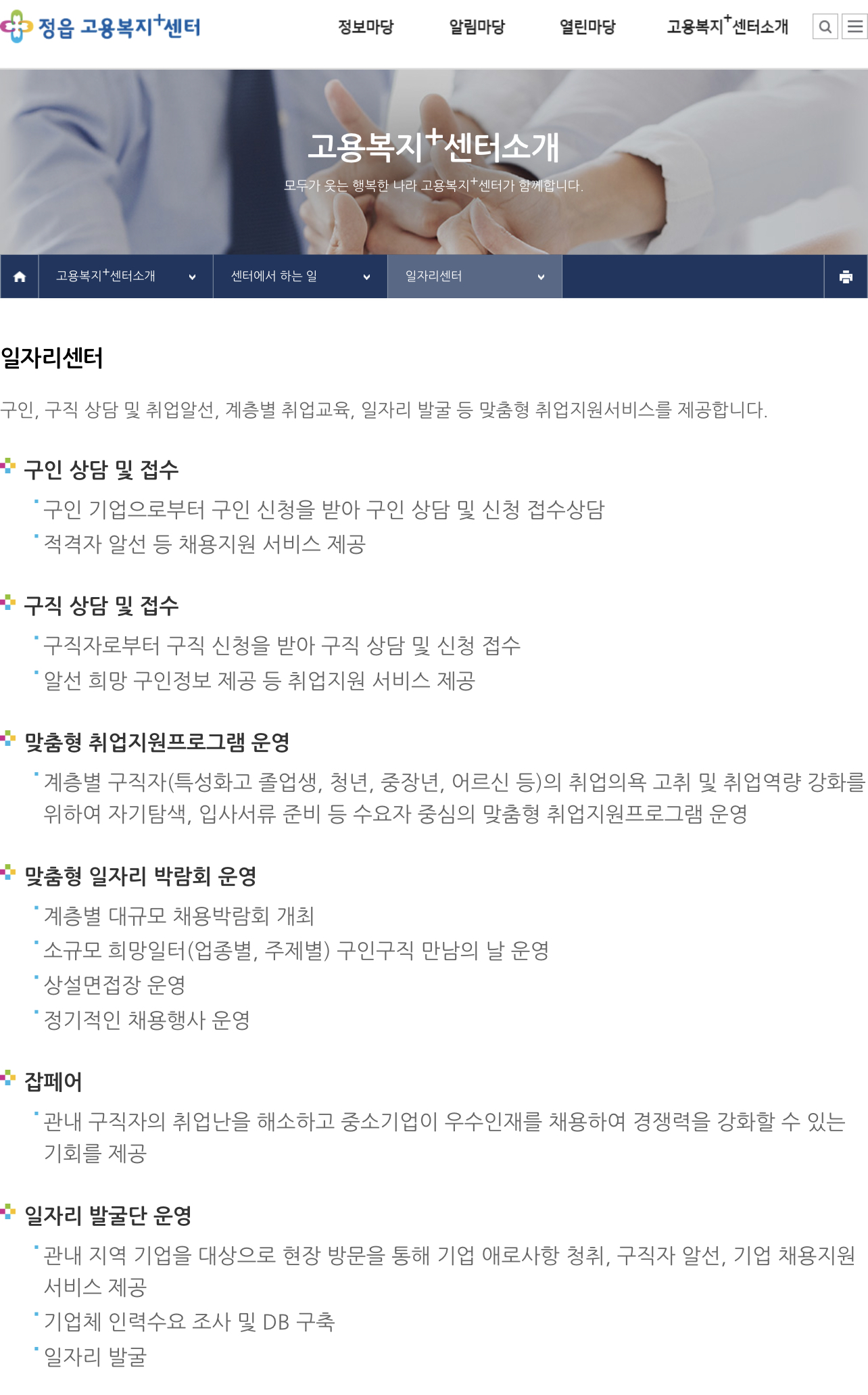 또한, 정읍고용복지플러스센터는 취업센터를 운영하여 구직, 구직상담 및 취업 알선, 계층별 직업훈련, 구직 등 맞춤형 취업지원 서비스를 제공하고 있습니다.